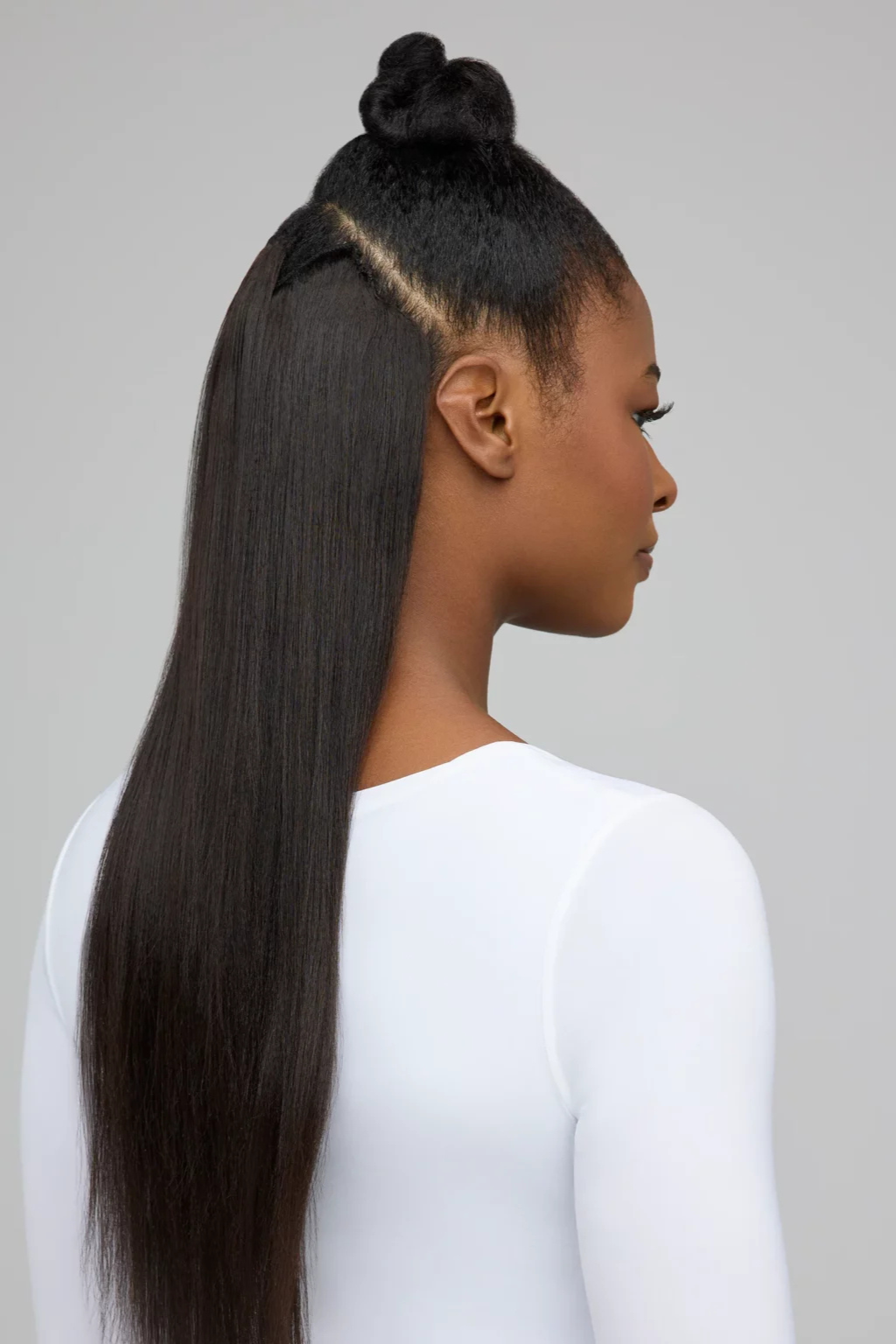 Nos tissages de cheveux Lissage Détendu sont lisses mais présentent une épaisseur et un léger brillant naturel qui imitent les cheveux défrisés en salon, pour un rendu naturel.